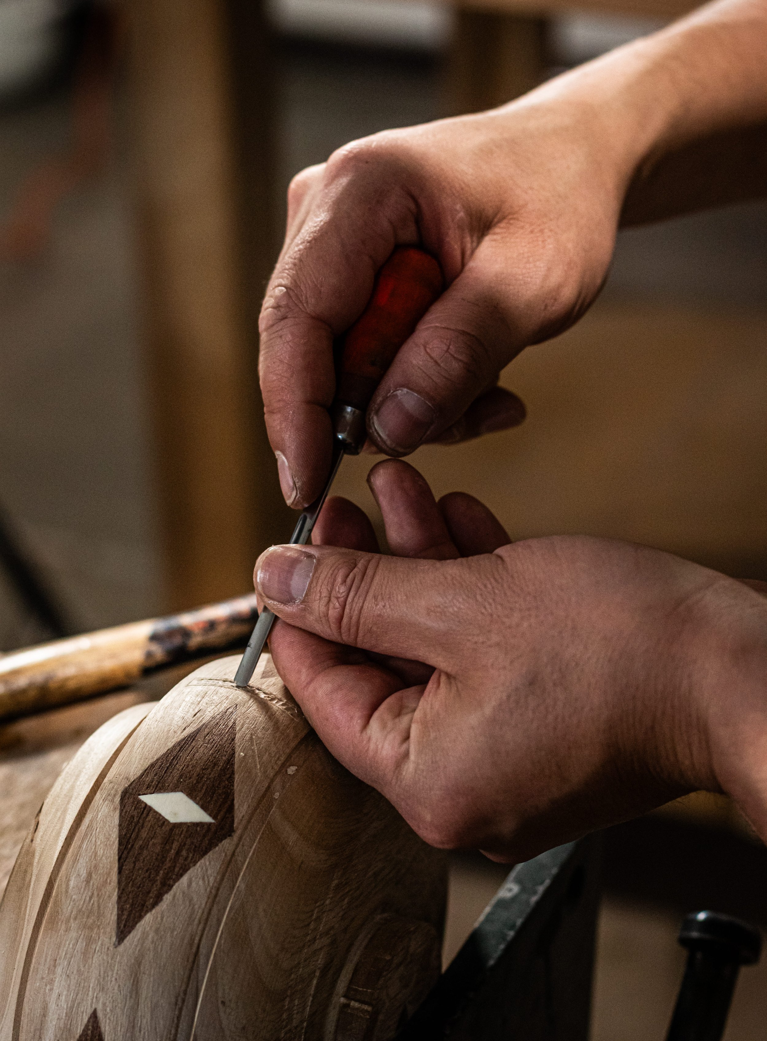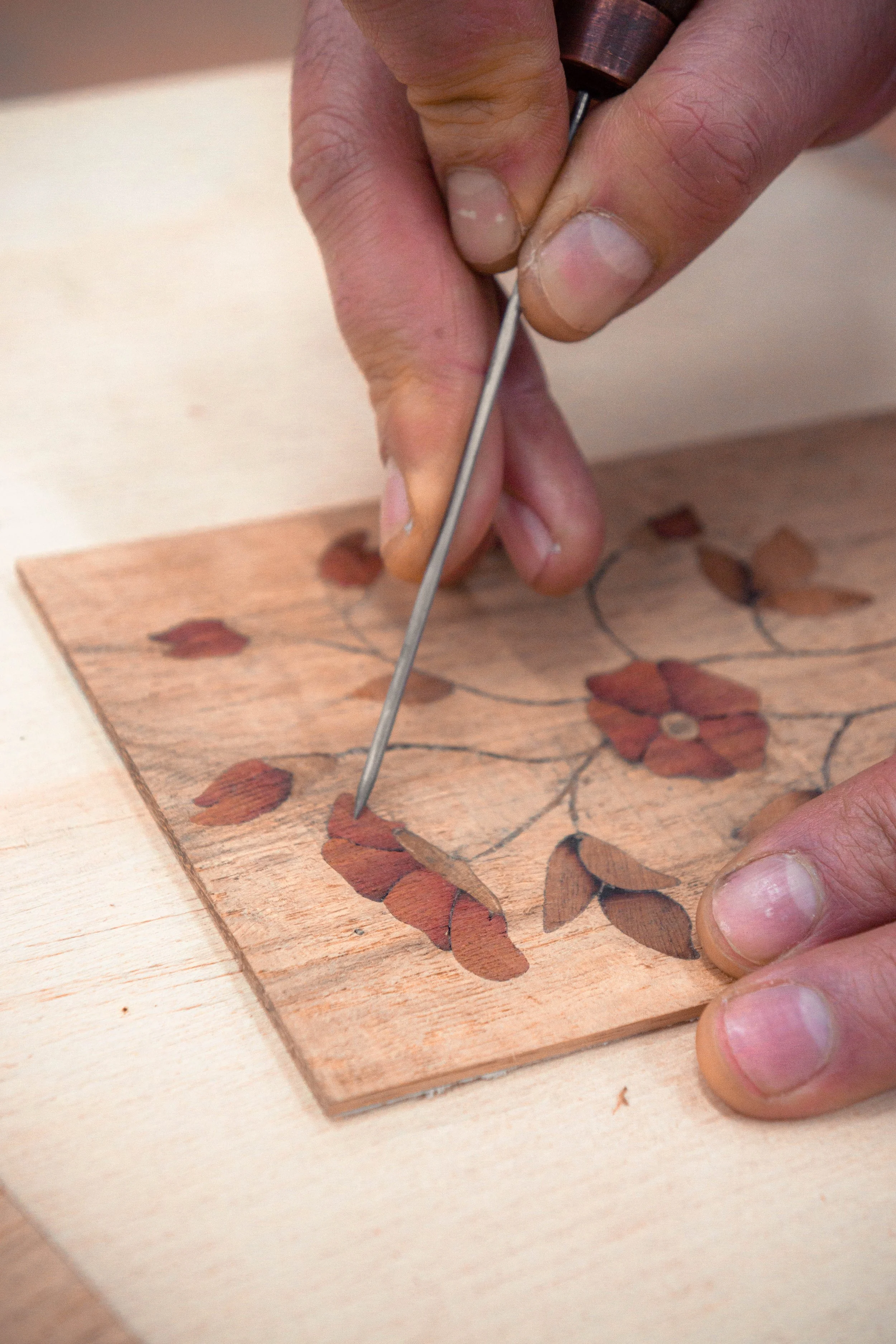 El programa de incrustaciones en madera desarrolla habilidades para crear composiciones decorativas a partir de patrones geométricos y orgánicos, aplicados sobre superficies planas y curvas