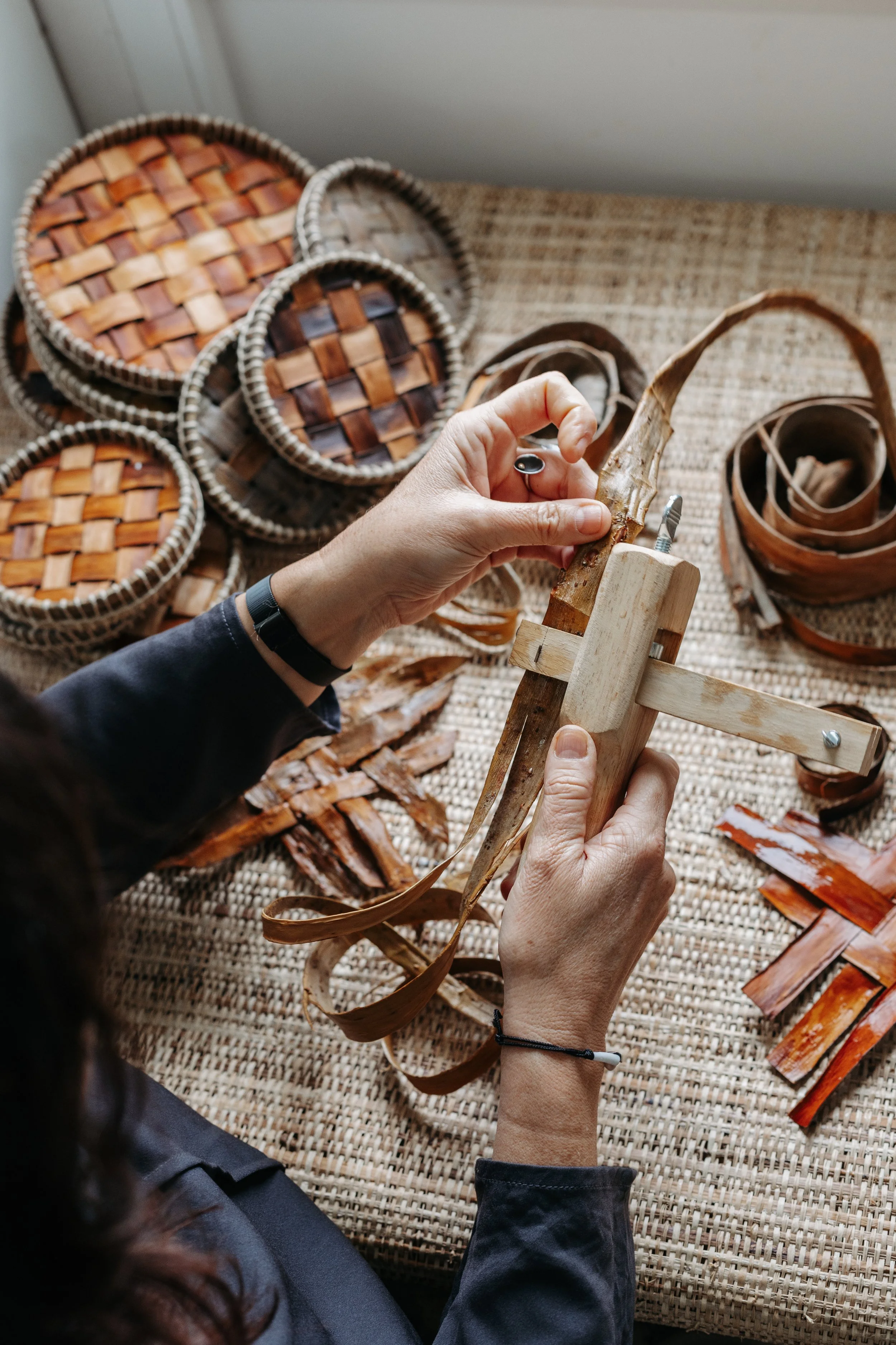 Vive una experiencia creativa, aprendiendo técnicas de cestería aplicadas al tejido en cuero, combinado con fibras naturales para crear volúmenes y contenedores de diferentes tamaños, formas y usos.
